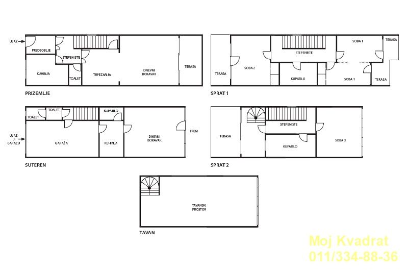 I sprat - tri spavaće sobe (svaka ima terasu), kupatilo;