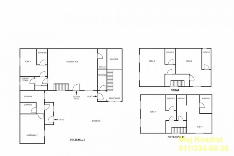 Prizemlje: ulazni deo (soba), dve odvojene sobe i dva kupatila.