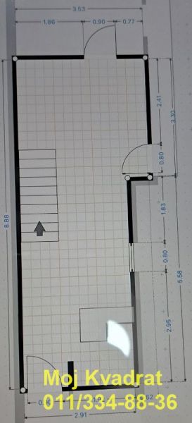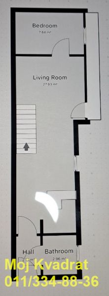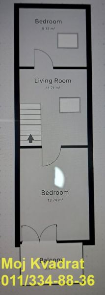 Prizemlje: hodnik, dnevna soba sa kuhinjom i trpezarijom (open space), spavaća soba i stepenište;