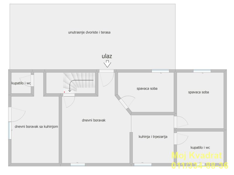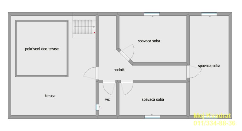 Prizemlje: komforan trosoban stan sa velikim kupatilom i praktično dve trpezarije. Stepenicama se ide na potkrovlje sa tri spavaće sobe, kupatilom i izlazom na veliku neobičnu terasu koja je projektovana kao lep vidikovac sa nadstrešnicom.