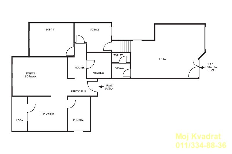 U ponudi stan 74m2 sa poslovnim prostorom 34m2. Poslovni prostor se nalazi u prizemlju, a stan na visokom prizemlju i povezani su sa 4 stepenika.