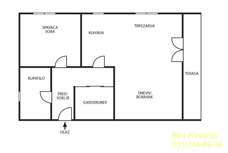 Sastoji se od prostranog dnevnog boravka sa trpezarijom i kuhinjom (koncept otvorenog prostora), spavaće sobe, kupatila i terase. Takođe, stan poseduje i poseban skriveni ugradni orman.