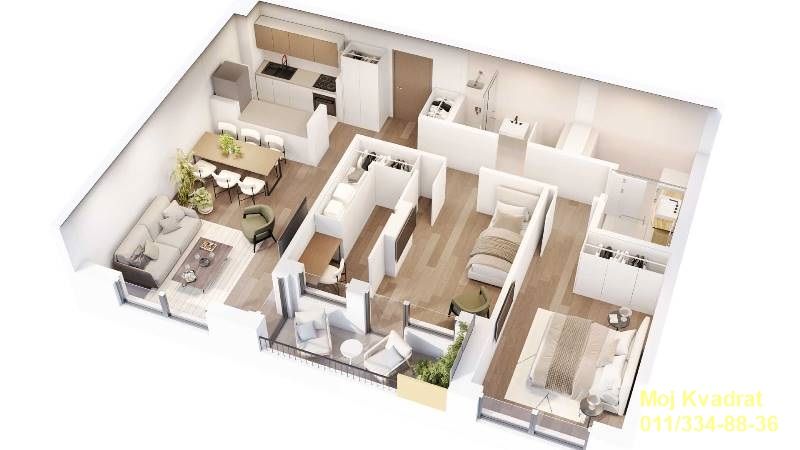 Prostorije: ulazni hodnik, dnevna soba, kuhinja, kupatilo, toalet, dve prostrane spavaće sobe, degažman, terasa.